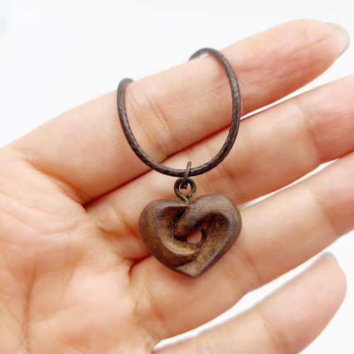 گردنبند چوبی منبت کاری شده که طرح قلب می باشد. این محصول از چوب گردو ساخته شده، بسیار زیبا و دارای چوب با رنگ طبیعی قهوه ای تیره که با رنگ روغن طبیعی رنگ آمیزی شده است.