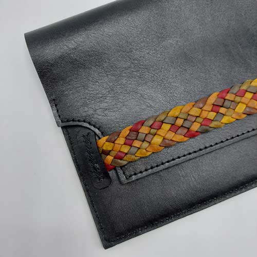 کیف کلاچ چرم طبیعی زنانه با بند بافته شده بارنگ های طبیعی، یه کار سبک و شیک برای خاص پسندها.